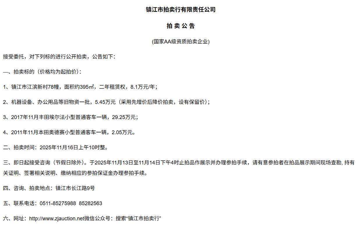 鎮江市拍賣行有限責任公司拍 租 公 吿(國家AA級資質拍賣企業)接受委托,對下列標的進行公開拍租(三拍),公告如下:—、拍租標的(以下價格均為半年至3年租賃權起拍價):1.  建行揚中豐裕支行營業網點二、三、四層經營用房(揚中市三茅鎮三豐南路5號),租賃面積約1080㎡,每層面積約360㎡,三拍底價11.98萬/年(0.3元/平方米/天)。2.  建行揚中油坊支行營業網點三、四層經營用房(揚中市油坊鎮太陽路129號),租賃面積約590㎡,每層面積約295㎡,三拍底價5.34萬/年(0.25元/平方米/天)。3. 建行揚中八橋支行營業網點三、四層經營用房(揚中市八橋鎮太平北路29號),租賃  面積約400㎡,三層約185㎡,四層約215㎡,三拍底價4.43萬/年(0.25元/平方米/天)。以上3套房產均可分層部分出租,拍租價=拍租面積*每平方米每天的租賃單價4. 建行鎮江團山路支行營業網點一層經營用房(鎮江市檀山路8號60幢102、103室),租賃面積約597.09㎡,三拍底價34.52萬/年。5. 建行丹陽原賢橋分理處營業用房(丹陽市城河路15-21號),租賃面積約93.88㎡,二拍底價7.16萬/年。二、拍租時間:2025年11月23日上午10時整。三、即日起接受咨詢(節假日除外)。于11月17日至11月21日下午4時止拍品作展示并辦理參拍手續,請有意參拍者在拍品展示期間現場查勘,持有關證明、簽署相關說明、繳納相應的參拍保證金辦理參拍手續。四、咨詢、拍租地點:鎮江市長江路9號五、聯系方式:0511-85275988   13655299933楊先生六、網址:http://www_zjauction_net.lalameansiloveyou.com;微信公眾號:搜索“鎮江市拍賣行” 拍品清單2025.11.23序號名稱起拍價(元)標的說明1建行揚中豐裕支行營業網點二、三、四層經營用房(揚中市三茅鎮三豐南路5號),租賃面積約1080㎡,每層面積約360㎡三拍底價11.98萬/年(0.3元/平方米/天)1、1-3號房產均可分層部分出租,拍租價=拍租面積*每平方米每天的租賃單價;2、意向競拍人在拍賣前需持營業執照或身份證與委托方說明租賃房產經營業態,確定意向后出具房產承租用途承諾書,經委托方審核后,方可交納保證金參加競拍;3、租賃期限為半年至3年(承租方與出租方協商而定),承租方每半年或一年結付租金,租賃期間的水、電費用及其它相關費用均由承租方承擔;4、承租方不得用于經營和保管危險物品,不得用于開設餐飲、娛樂等可能嚴重影響消防安全、運營安全的經營業態,不得用于經營委托貸款、小額貸款等可能冒用委托方名義,帶來聲譽風險的經營業態。租賃期內,承租方不得破壞墻體結構,自行成就消防、安全等使用條件,不得擅自將租賃房屋轉租、轉讓給他人使用,否則委托方有權收回房屋;5、拍租成交后,承租方將租金交至出租方指定賬戶,傭金交至拍賣方賬戶(拍租傭金為該房屋一個月租金)。承租方憑租賃合同無息退還保證金。2建行揚中油坊支行營業網點三、四層經營用房(揚中市油坊鎮太陽路129號),租賃面積約590㎡,每層面積約295㎡三拍底價5.34萬/年(0.25元/平方米/天)3建行揚中八橋支行營業網點三、四層經營用房(揚中市八橋鎮太平北路29號),租賃面積約490㎡,每層面積約245㎡三拍底價4.43萬/年(0.25元/平方米/天)4建行鎮江團山路支行營業網點一層經營用房(鎮江市檀山路8號60幢102、103室),建筑面積約597.09㎡三拍底價34.52萬/年5建行丹陽原賢橋分理處營業用房(丹陽市城河路15-21號),建筑面積約93.88㎡二拍底價7.16萬/年